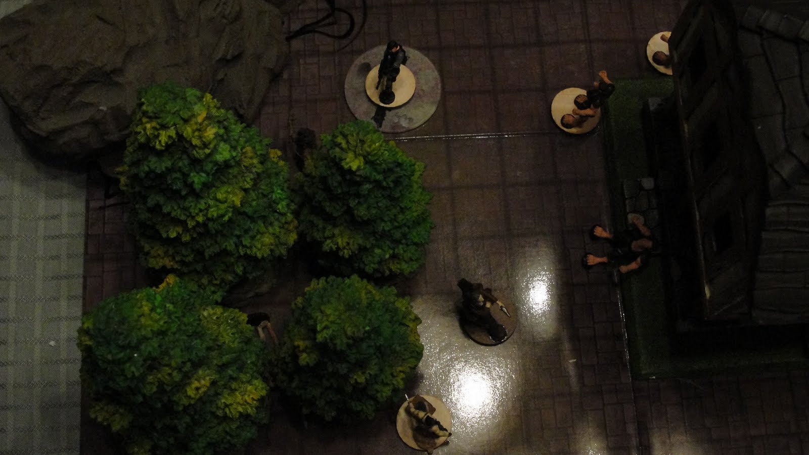 The next picture (left) is a closeup of the action on one side of the main building. My character is a mountie riding a horse in the top center. Another character is to the right of the trees. The remaining minis represent bodies stuck in ice (they haven't reanimated yet. The minis are from Horrorclix. I picked up a bunch of them for very cheap and they have a ton of uses. In order to fit them on the board, I rebased them. My mini's horse is from the GaleForce9 D&D character token sets. You can barely make out another body in the center of the trees.