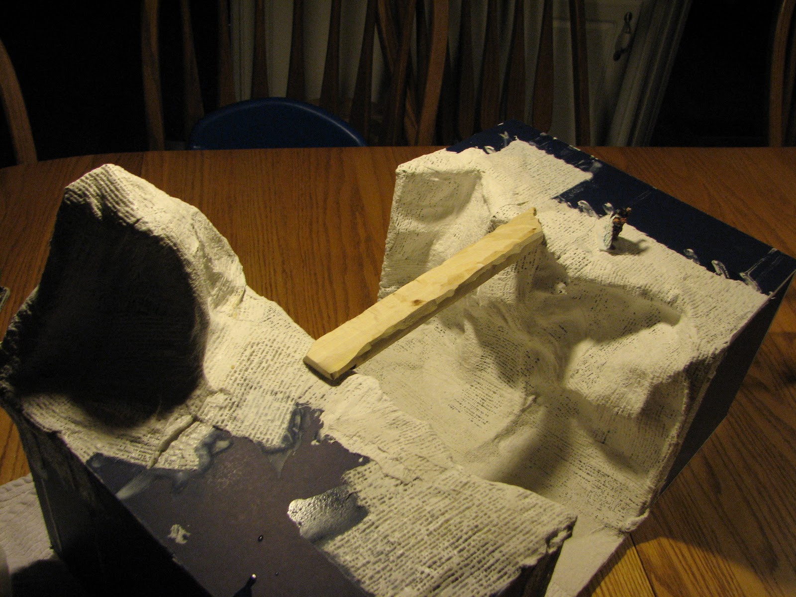 I then coated the wire mesh in plaster cloth (found at any local hobby store) and added the opposing ravine wall by the same method as the first. When cutting out the top piece, I left the ravine-ward side very jagged to appear more natural and less designed. After the second ravine wall was coated in plaster cloth, I added a small mountain on the top of one of the ravines to make each side visually distinct. First, I built up the support by using foam board with no exact measurement, and then added the wire mesh haphazardly before finishing it with plaster cloth.